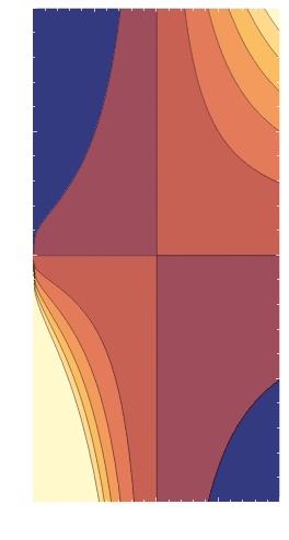 でも、複素数の世界(2枚目の等高線プロット)でその地点を真上から見下ろすと……